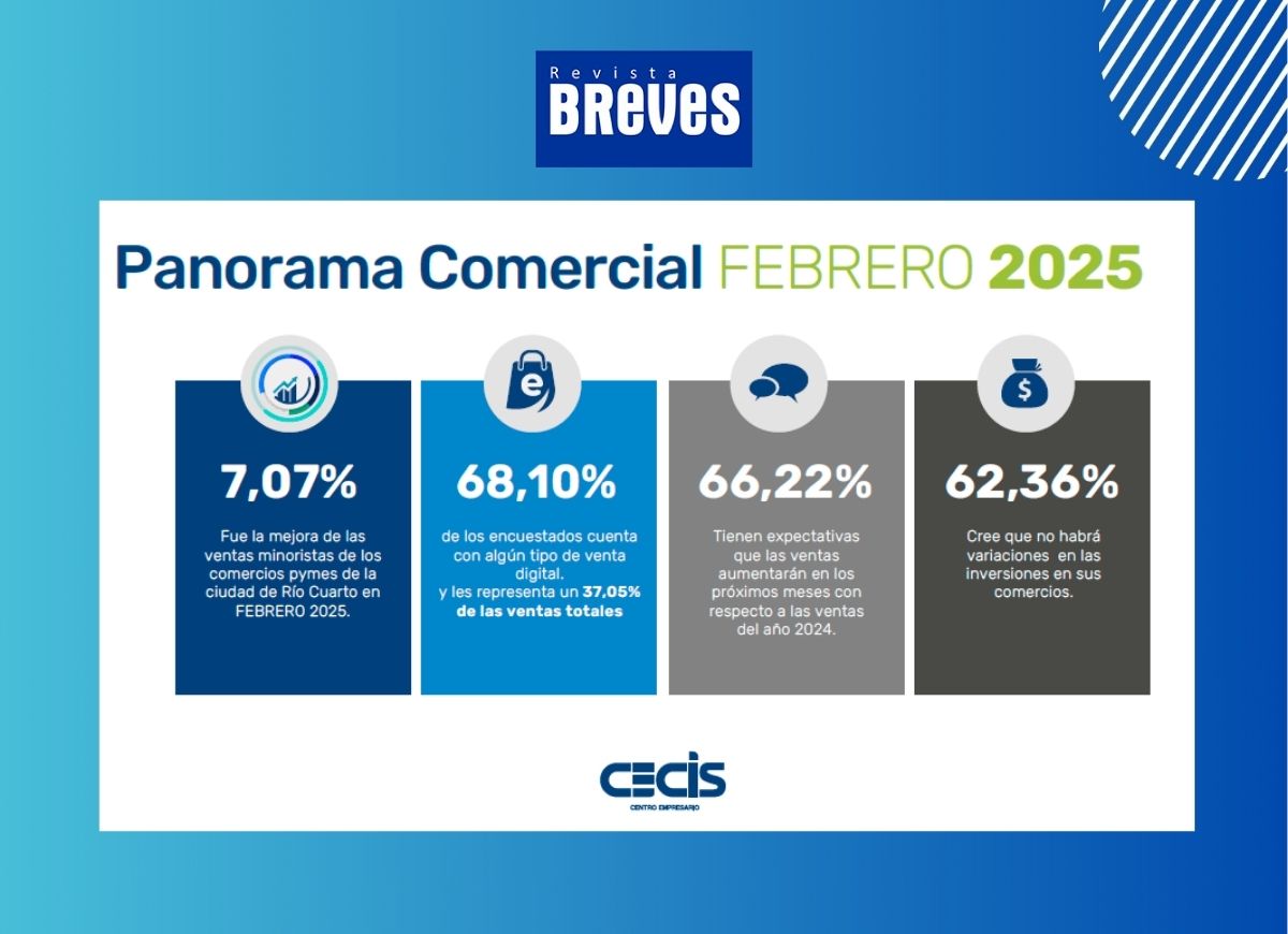 El Centro Empresario, Comercial, Industrial y de Servicios (CECIS) presentó el panorama comercial de febrero 2025 para la ciudad de Río Cuarto. El informe mostró que el mes cerró con una mejora del 7,07% en la actividad comercial respecto a febrero de 2024, un dato alentador para los distintos sectores que conforman la economía local.