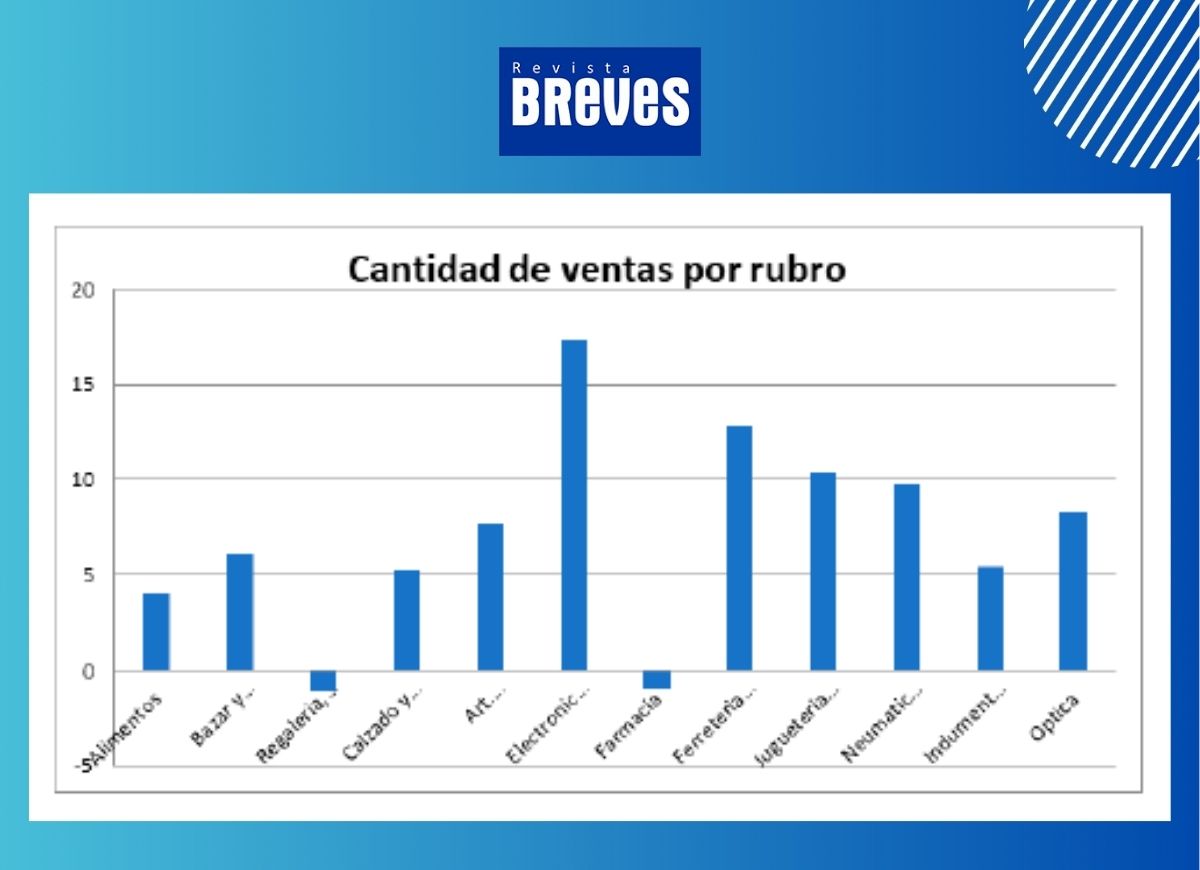 El resto de los sectores presentó variaciones positivas: alimentos creció un 4,07%, bazar y amoblamientos un 6,16%, calzado y marroquinería un 5,21%, y ferretería y materiales para la construcción un 12,76%. La juguetería y librería también vieron una mejora del 10,36%, mientras que neumáticos y repuestos de autos y motos incrementaron un 9,69%. Indumentaria registró un 5,45% y óptica un 8,30%.