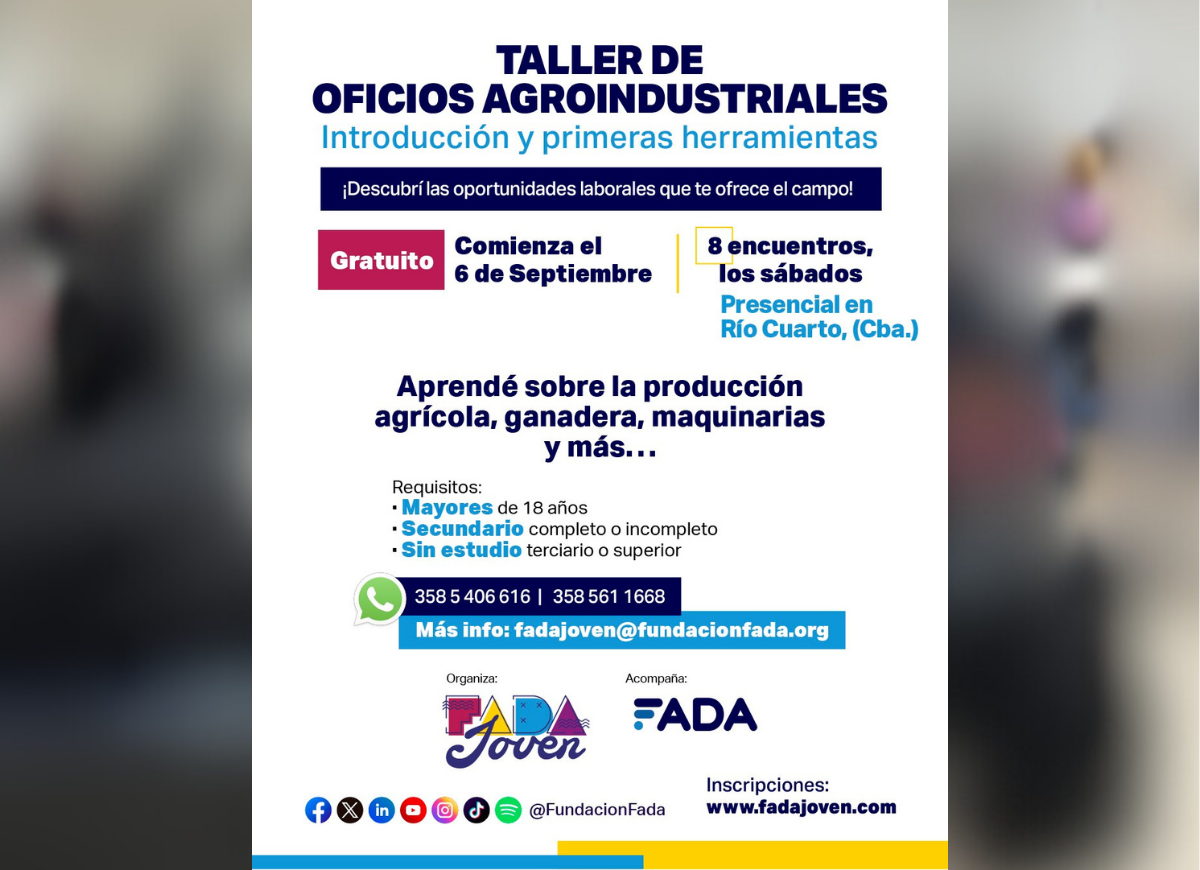 La Fundación Agropecuaria para el Desarrollo de Argentina (FADA), a través de su área FADA Joven, anunció la apertura de inscripciones para el Taller de Oficios Agroindustriales, que tendrá lugar en la ciudad de Río Cuarto a partir del sábado 6 de septiembre.